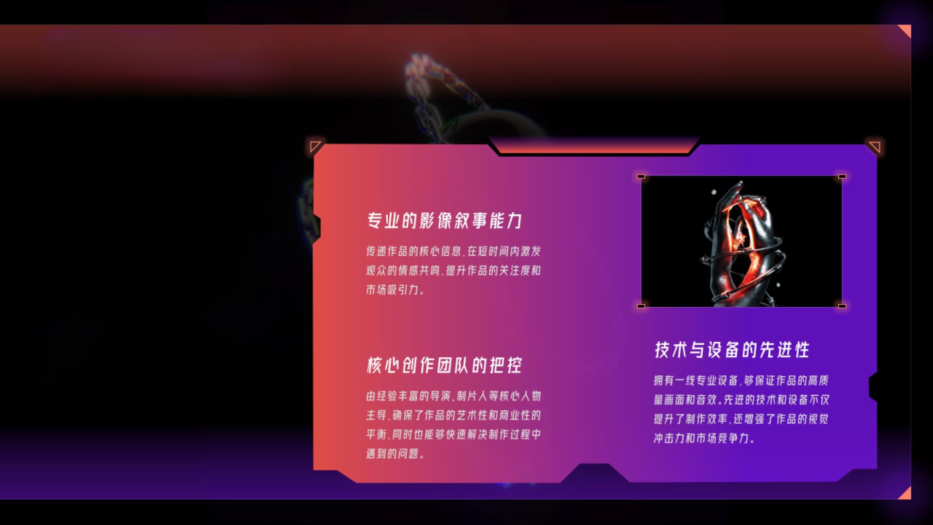 魔方文化はプロフェッショナルなチームを擁し、脚本、キャスティング、撮影、編集、特効、声優など、映像制作の全ての工程をサポートし、最終的な作品の品質を保証します。